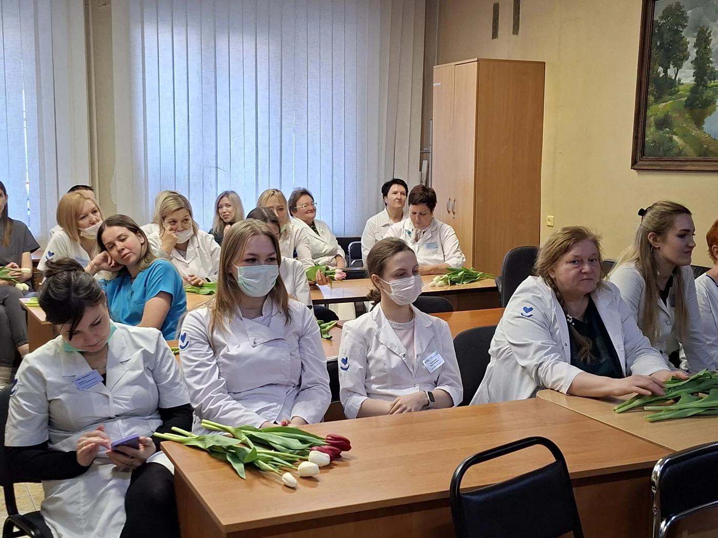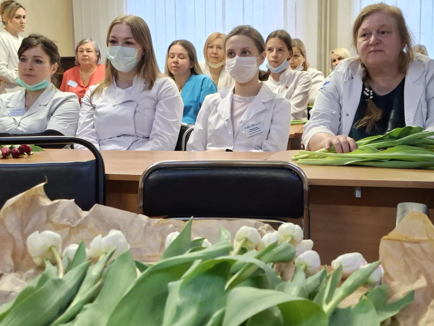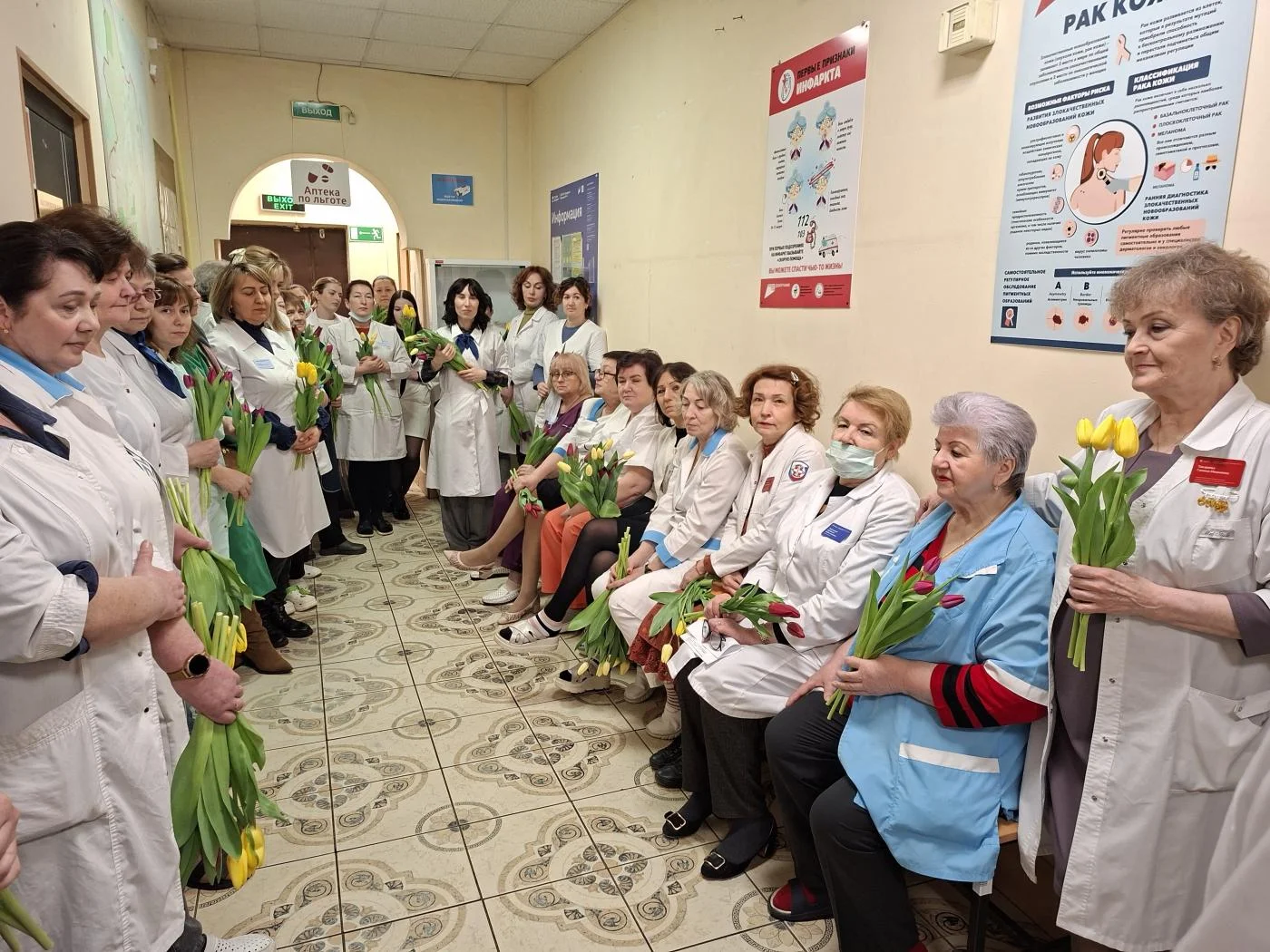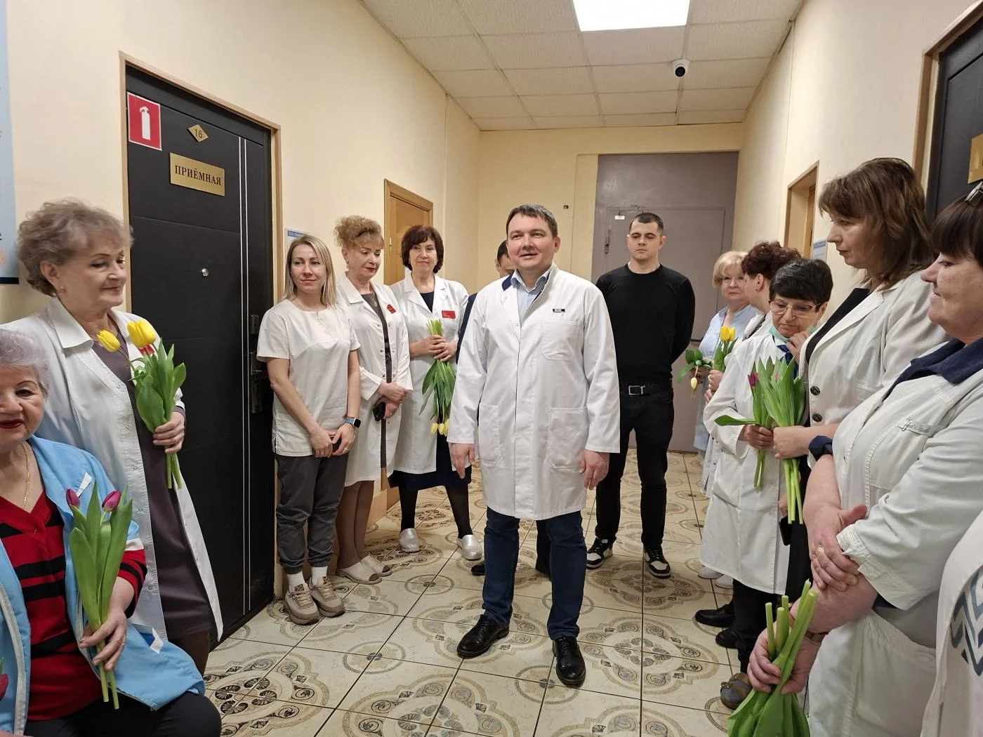 Нежные приветственные слова и первые весенние тюльпаны предназначались женщинам-медикам и представительницам немедицинского персонала всех структурных подразделений учреждения – на улицах Университетской, Горького, Тельмана, Колхозной, А. Невского, Краснопрудной, Больничной, а также на Московском проспекте.