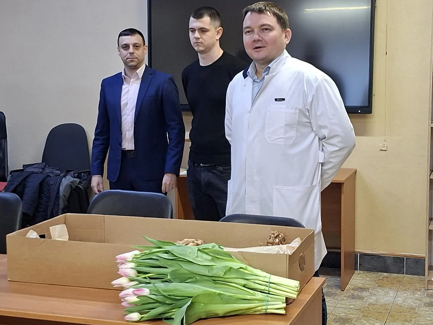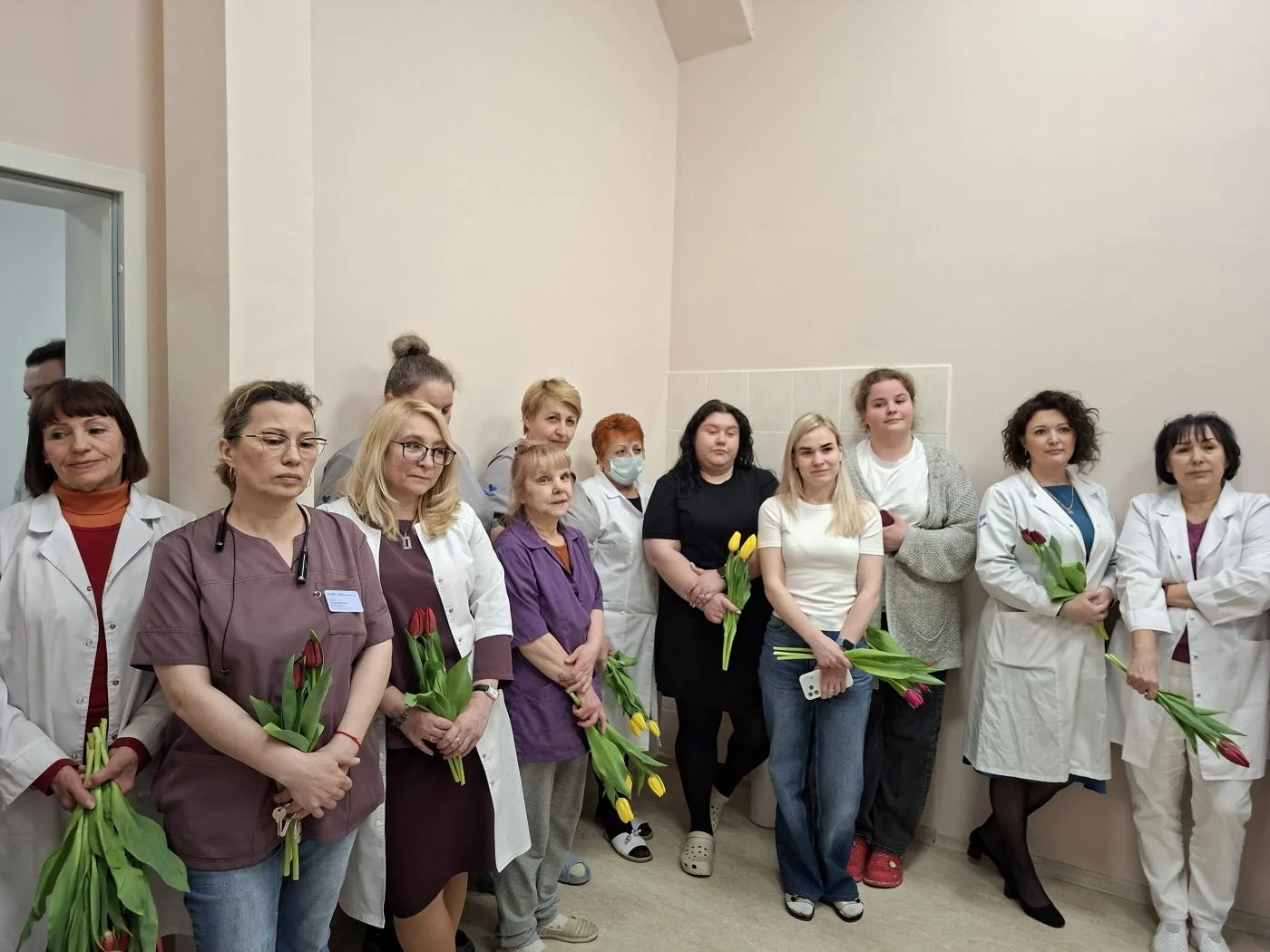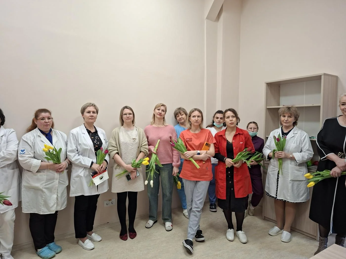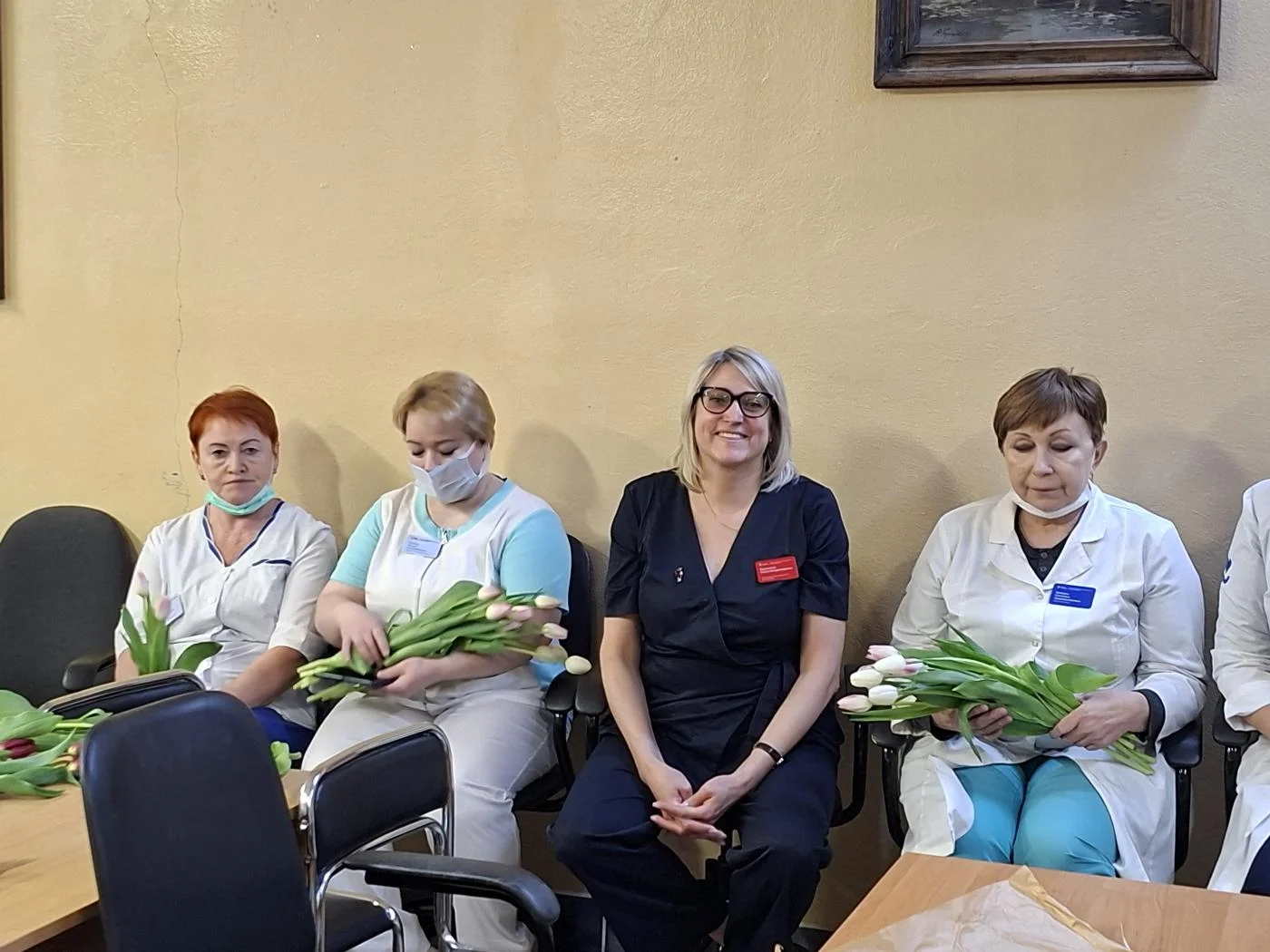 Нежные приветственные слова и первые весенние тюльпаны предназначались женщинам-медикам и представительницам немедицинского персонала всех структурных подразделений учреждения – на улицах Университетской, Горького, Тельмана, Колхозной, А. Невского, Краснопрудной, Больничной, а также на Московском проспекте.